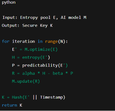 在量子环境下,密钥生成必须避免固定规则带来的可预测性,提升熵源的复杂性和动态演化能力。AI模型在该过程中承担熵分布优化与随机性评估的双重角色。具体而言,密钥生成机制基于强化学习 + 神经网络:强化学习框架通过奖励函数引导网络逐轮优化熵源分布,奖励函数由两部分构成: