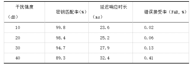 认证性能在低至中等干扰下保持高匹配率与低延迟状态,匹配率下降与错误接受率增长主要在40dB以上干扰环境下出现,说明协议结构对抗高噪通道下的稳定性与自适应判断能力仍具优化空间。