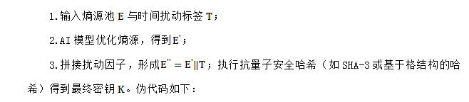 为权重因子。该设计确保模型在最大化随机性的同时,抑制模式化趋势。神经网络采用三层结构:输入层接收异构特征(如硬件噪声、时序抖动、传感器采样),隐藏层通过ReLU和tanh组合实现非线性映射,输出层生成候选熵块。AI模型在每一轮迭代后执行统计分布校验,如卡方检验和NIST随机性测试,并将结果反馈给强化学习代理,驱动参数更新。最终的密钥生成过程可表示为: